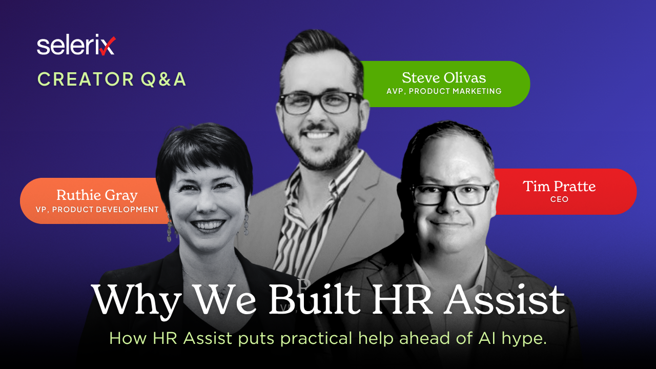 To get the story behind the product, we sat down with two of the people who helped bring it to life: Selerix CEO Tim Pratte and VP of Product Development Ruthie Gray. Our own Steve Olivas, AVP of Product Marketing got them talking about why we built HR Assist the way we did, what makes it different, and what’s next.
