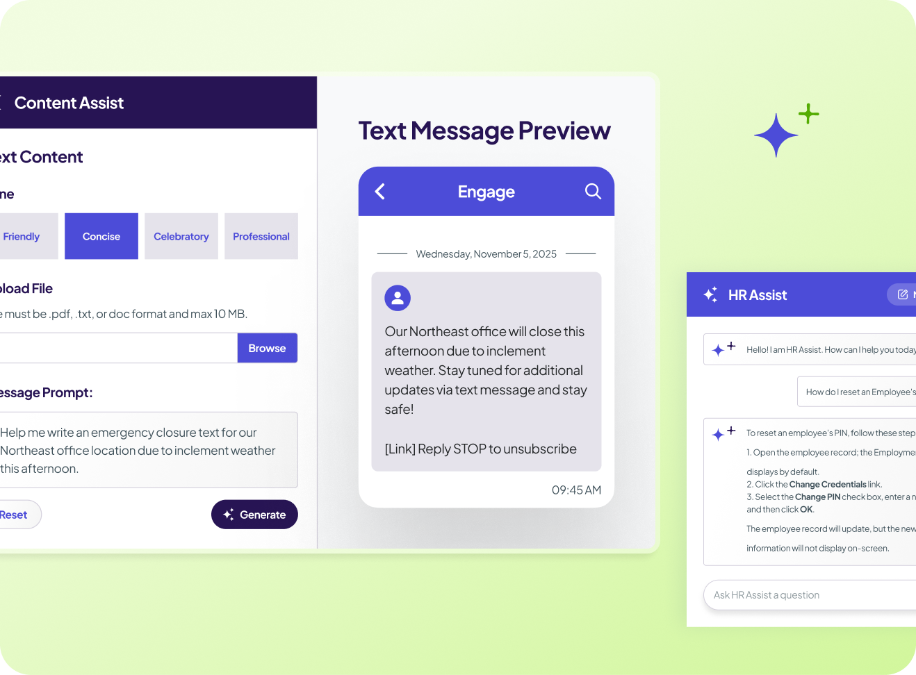 - Content Assist (built into Engage) Helps HR teams and brokers turn complex benefits materials — like plan documents or benefit guides — into clear, employee-ready communications in seconds. Using your own content and tone, it simplifies information and makes it easy to deliver messages employees can understand, across email, SMS, and more.