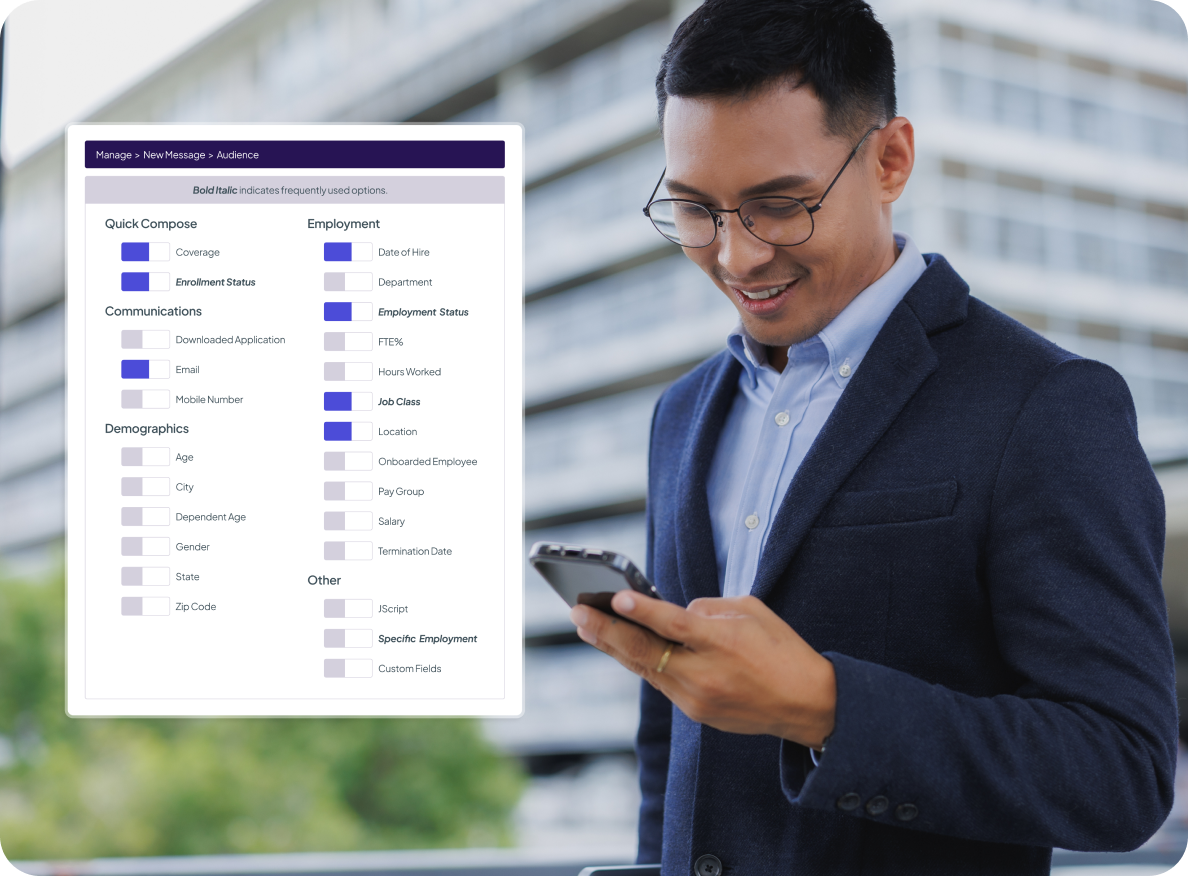 Blanket messaging creates fatigue and mistrust. In fact, 1 in 3 employees say they’ve ignored benefits messages because they didn’t feel relevant to them. Engage employee communications are data-driven and targeted, defining exactly who receives each message based on job class, location, eligibility, enrollment status, or past behavior.