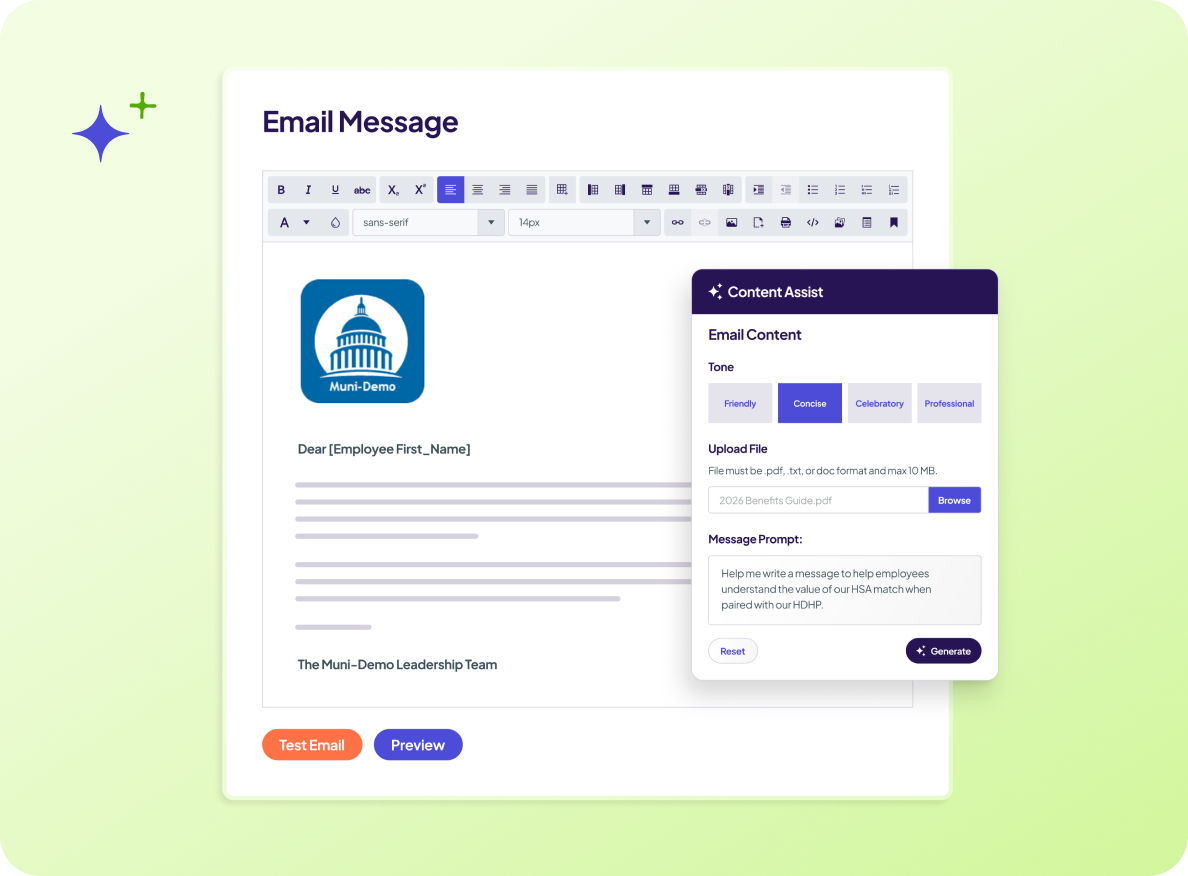Benefits language is complex — and writing about it shouldn’t slow you down. Selerix Engage includes Content Assist, our AI-powered writing assistant, that helps HR teams and brokers create plain-language, employee-ready messages in seconds. Upload your benefit guides, policies, or handbooks, and Content Assist will reference them to help you craft clear, on-brand communications employees can actually understand.